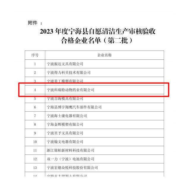 寧波科瑞特動物藥業(yè)有限公司成功通過2023年度寧??h清潔生產審核驗收!